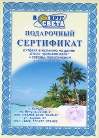 Неограниченные возможности туристического подарочного сертификата Владелец туристического подарочного сертификата имеет право: Приобрести тур (или несколько туров) в туристсской компании "Вокруг света" стоимостью, равной стоимости данного сертификата (или суммарной стоимости нескольких сертификатов). Доплатить часть денежных средств и приобрести более дорогой тур. Выбрать место, время, сроки поездки в рамках, оговоренных в сертификате и в рамках туров, предлагаемых компанией "Вокруг света". Обслуживание туристических подарочных сертификатов Сертификат должен быть предъявлен в офисе компании "Вокруг света" для получения тура в течение срока, указанного в договоре. Сертификат нельзя обменять на денежный эквивалент, указанный в сертификате. При приобретении сертификата заключается договор, регулирующий отношения между сторонами.